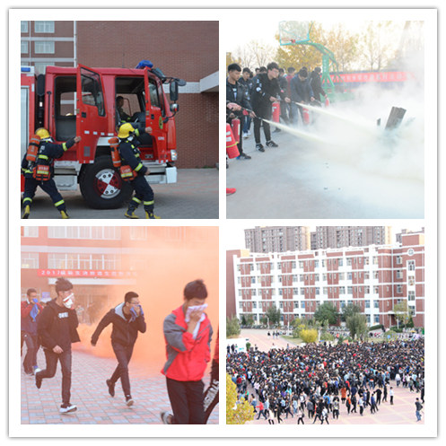 王院长宣布演习正式开始,各指定地点准时点燃烟雾弹,警报响起,消防车及时赶到现场并迅速扑火;同学们在各楼层引导员的指引之下用湿毛巾捂住口鼻紧张而有序得逃离并在安全地点站好;一号楼三层被困人员发出求救信号,消防车搭起云梯,消防员将被困人员成功解救。20分钟后,所有人员成功逃离。