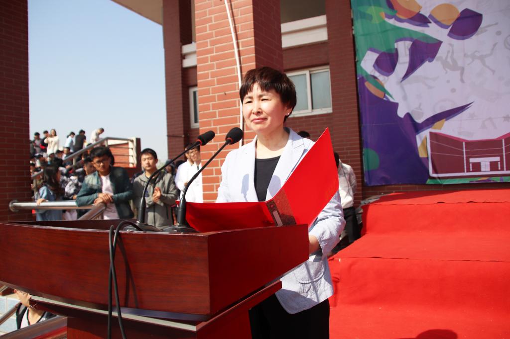 黄骅市政府副市长张桂云致辞,她首先对海滨学院第十届田径运动会的隆重开幕表示热烈祝贺;其次恰逢五四青年节向必赢官网青年学子和教职工致以节日的问候;最后感谢必赢官网积极响应政府号召,重视人才培养的同时,积极参与体育文化活动,为我市体育文化的发展贡献力量。