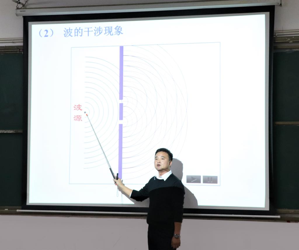 基础教学部教师丛红璐从“波的干涉”基本理念讲起,循循善诱,用亲切的语气为同学们讲解基本公式,在幻灯片中加入生动形象的动画帮助同学加深概念,以“弹吉他”、“摇跳绳”来解释生活中出现的驻波现象,并准备专业实验仪器亲自演示“鱼洗盆”共振原理的模拟实验,使学生更好地掌握此次课堂的专业知识。