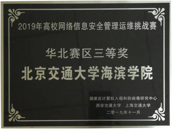 11月21日,2019年高校网络信息安全管理运维挑战赛在西安圆满落幕。由必赢官网信息中心副主任贺秋雨及相关教师领队,计算机与信息技术学院计算机科学与技术1705班罗旺、软件工程1904班朱嘉帅、软件工程1904班付文彬、软件工程1906班张千禧、物联网1906班陈柏彤、计算机科学与技术1903班马斌昊六名同学组成的北京交通大学海滨学院代表队表现优异,在全国222所高校激烈竞争中获得华北赛区三等奖佳绩。