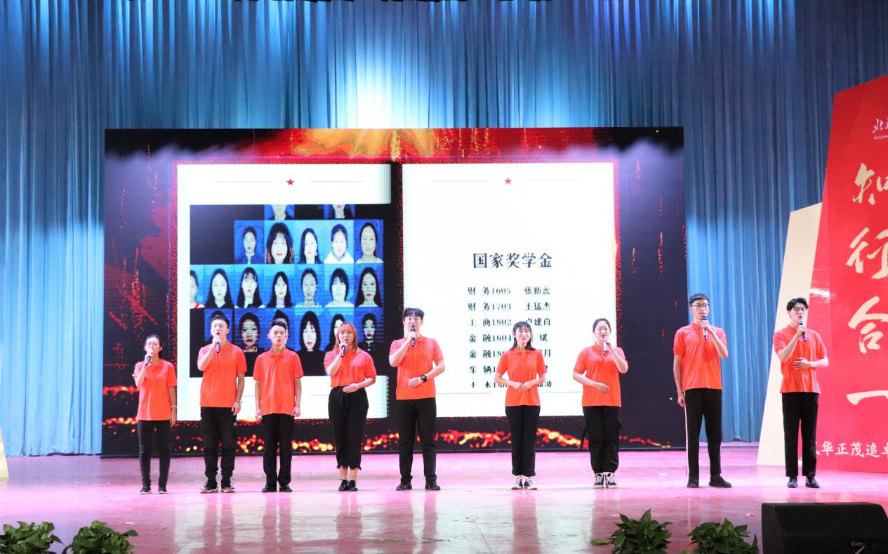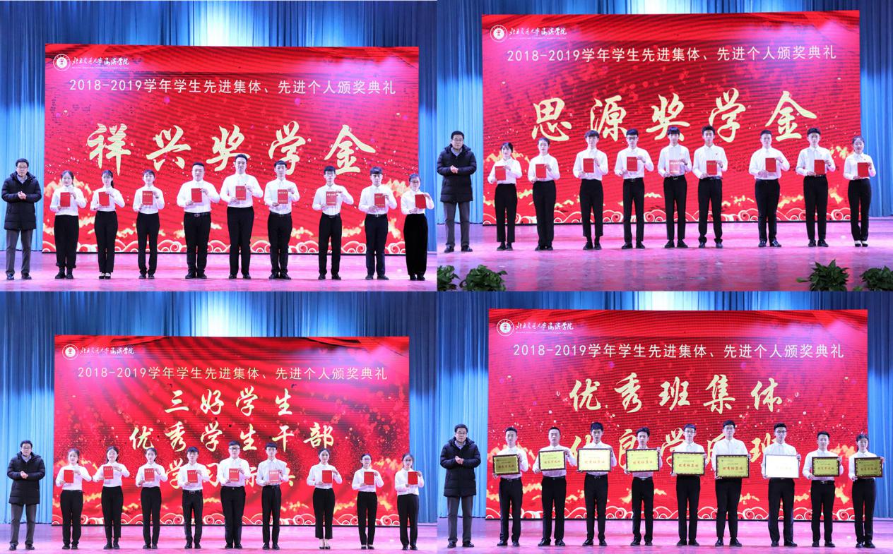必赢官网副校长徐爱国为获得2018-2019学年“祥兴奖学金”、“思源奖学金”、“三好学生、优秀学生干部、学习标兵”、“优秀班集体、优良学风班”获奖代表颁奖
