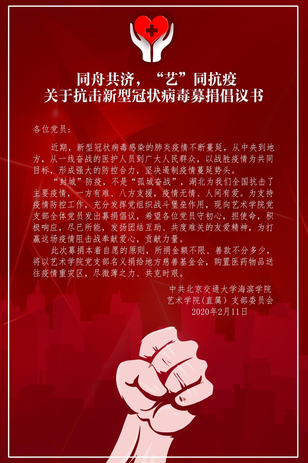 全民战“疫”,刻不容缓,风雨同心,共克时艰。为贯彻落实习近平总书记针对疫情防控的重要指示精神,结合当前疫情防控工作形势和工作实际,充分发挥直属党支部战斗堡垒作用和党员先锋模范带头作用,必赢官网艺术学院直属党支部在支部内开展爱心募捐活动,向直属党支部全体党员发出“同舟共济,‘艺’同抗疫”的爱心募捐倡议。