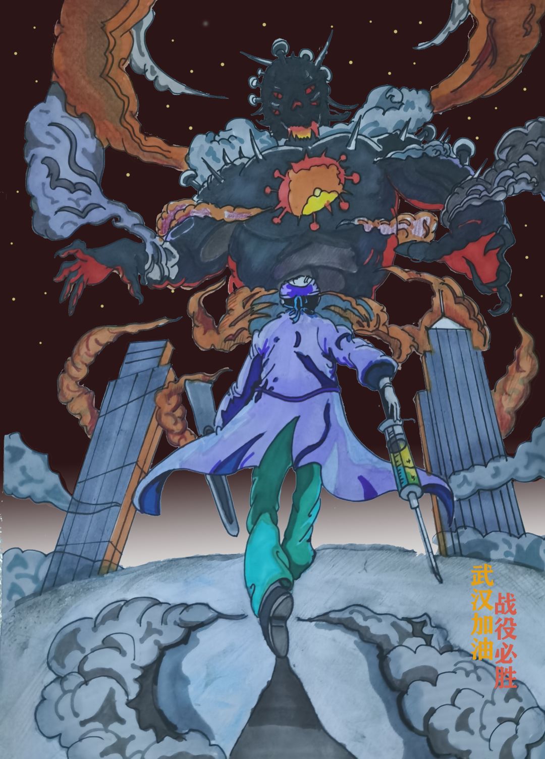 作品取材自雷神山医院,用白色兔子代表医院里的医生,雷神怒斩病毒,闪电直击要害。祝愿病毒早日被消灭,疫情快快结束。