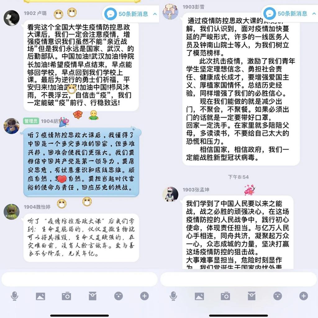 必赢官网党委高度重视“全国大学生同上一堂疫情防控思政大课”的组织工作,宣传统战部、校团委、基础教学部思政教研室等单位和各学院(系)第一时间发布收看通知,思政教研室更是将“全国大学生同上一堂疫情防控思政大课”纳入到疫情防控期间思政课的教学统一安排之中,合理设计教学环节,组织学生进行线上集体讨论,引导学生畅谈感想,将思想政治理论课教学优势转化为防疫斗争的强大力量。