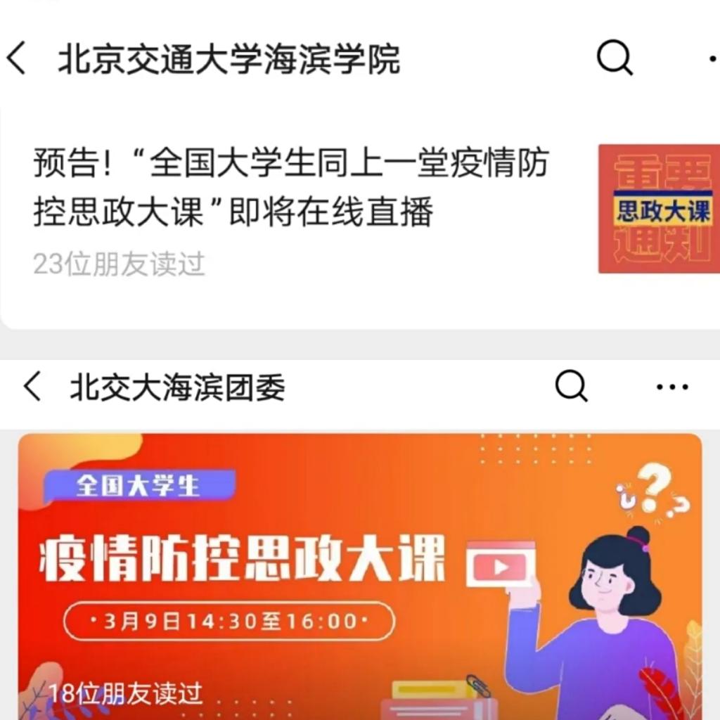 下午2:30开始,14000余名海滨学子齐聚“云端”,共同聆听这场“思政大课”。“思政大课”邀请了清华大学马克思主义学院艾四林、中国人民大学马克思主义学院秦宣、北京师范大学马克思主义学院王炳林、中央财经大学马克思主义学院冯秀军四位教授,深入解读党中央关于疫情防控的决策部署,分析中国抗疫彰显的中国共产党领导和中国特色社会主义制度的显著优势,讲述防疫抗疫一线的感人故事。