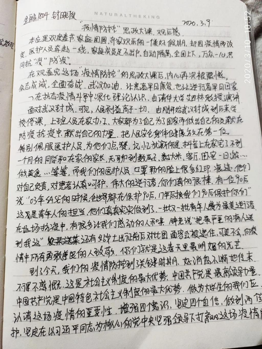 王小红老师认认真真听了四位老师的授课表示受益匪浅,“他们是专家、学者、优秀人民教师,在这个特殊时期,他们从不同的角度对当下的国情、社情进行解读,明确了中国青年学子的担当与使命,彰显了传道授业解惑为师之道。我在学习过程中,思考更多的问题是,作为一名思政课教师,如何上好每一堂网络思政课,在平凡的岗位上默默为疫情防控期间的教育教学工作贡献自己的力量,用实际行动诠释着一名党员同志、一名思政课教师在国家危难时刻的责任与担当,做大学生思想政治教育的持久引导者,为新时代思政教师做出表率,为共产党员做出表率,为疫情期间的广大教师做出表率!”