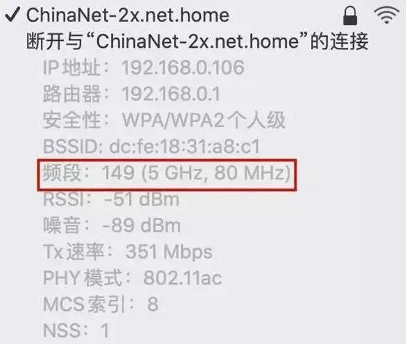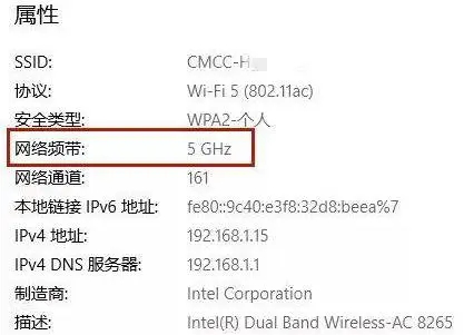 查看“网络频带”,如显示5 GHz,说明已连接使用