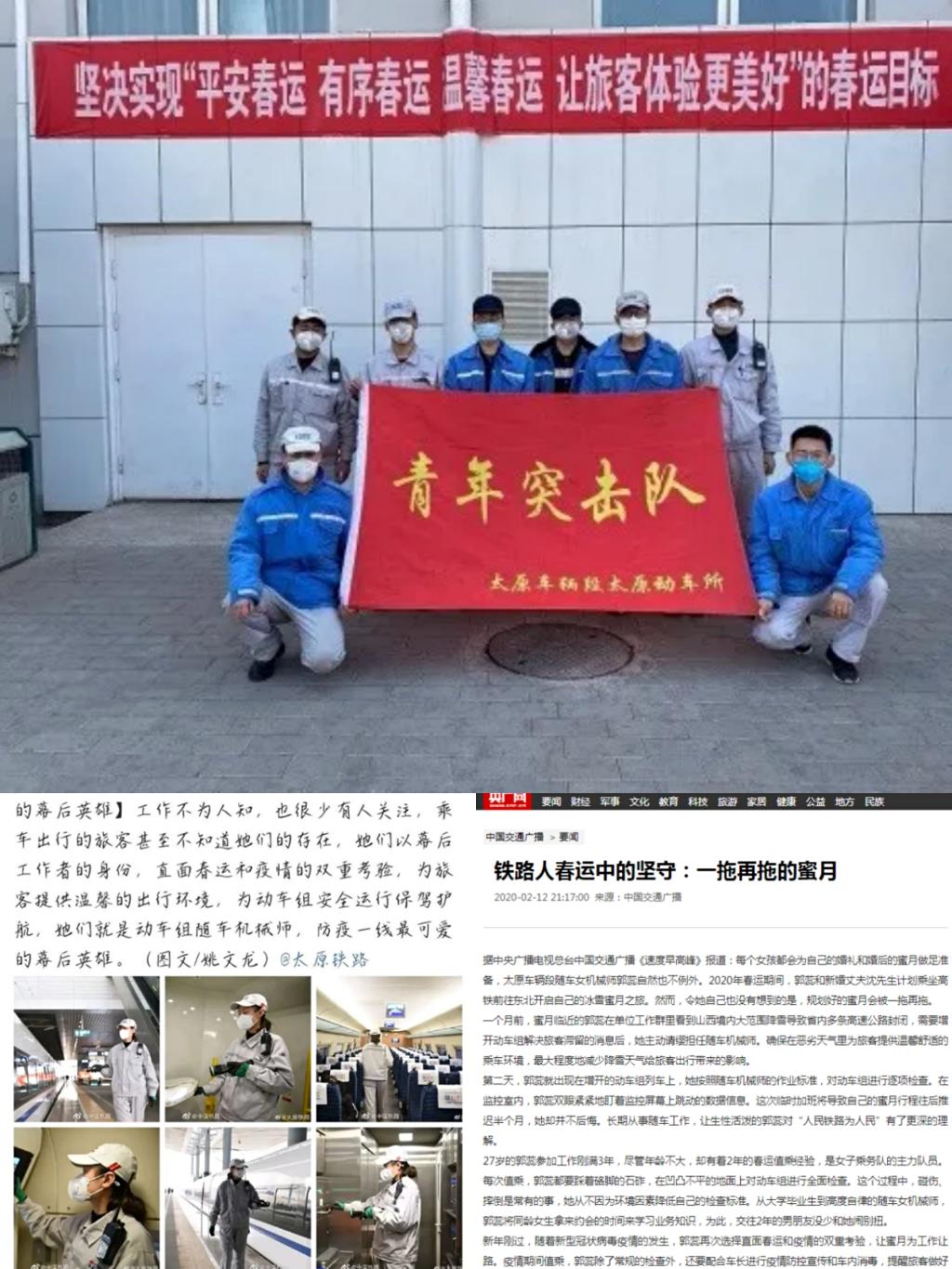 在全民共战疫情、全员防控疫情中,现就职于太原铁路局太原车辆段动车所,原电子信息与控制工程系自动化1302班的姚文龙,发挥新闻采写专长,主动对接新闻媒体,对所在单位抗击疫情一线职工进行采写,先后完成多篇通讯稿件,其中《一拖再拖的蜜月》、《不负青春绽芳华》、《“00”后车辆乘务长的春运首秀》、《防疫一线的幕后英雄》等新闻稿件在《中央人民广播电台》、《人民铁道报》、《人民铁道官方微博》、《山西云媒体》等多家媒体刊播,被评为太原车辆段2020年春运十佳骨干通讯员。