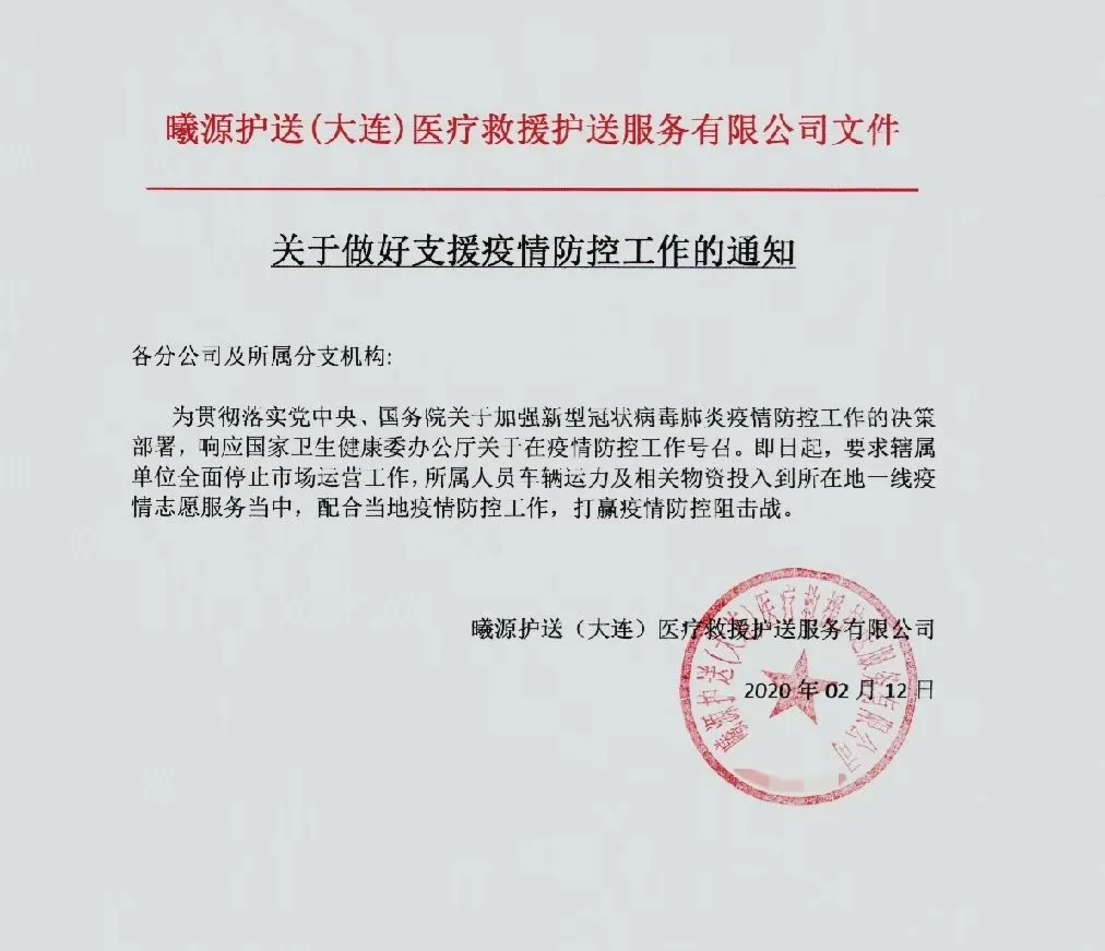 当疫情战役打响后,为贯彻落实党中央、国务院关于加强新型冠状病毒肺炎疫情防控工作的决策部署,响应国家卫生健康委办公厅关于在疫情防控工作号召,曦源护送要求辖属单位全面停止市场运营工作,所属人员车辆运力及相关物资投入到所在地一线疫情志愿服务当中,配合当地疫情防控工作,打赢疫情防控阻击战。