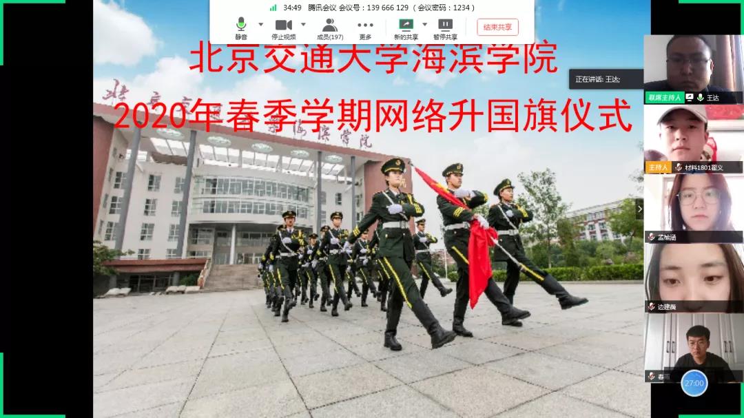 2020年4月13日7:00,必赢官网于腾讯会议顺利举行“抗击疫情众志成城,海滨青年力学笃行”网络升旗仪式。党委副书记魏炜、学生处全体教师、校级学生组织学生参加本次升旗仪式,本次仪式由学生处教师王达主持。
