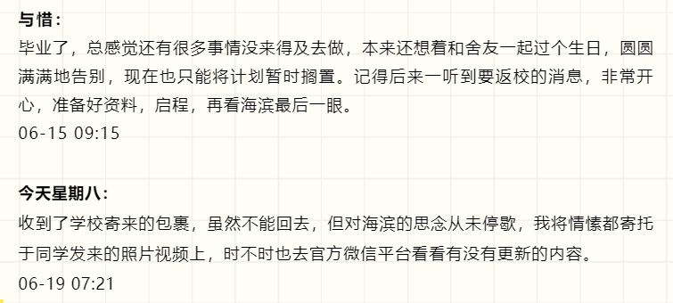 “这一天,我开始仰望星空,发现星并不远,梦并不远,只要踮起脚尖......”海滨见证了我的成长,我亲历了海滨的变化。因为不期的缘分和共同的向往,我们从大江南北相聚在一起,此刻分离,情谊深长。朝夕耕耘,图春华秋实;十年寒窗,求学有所用。千言万语,化作一句:“祝愿海滨全体2020届毕业生万事胜意,常回家看看。”